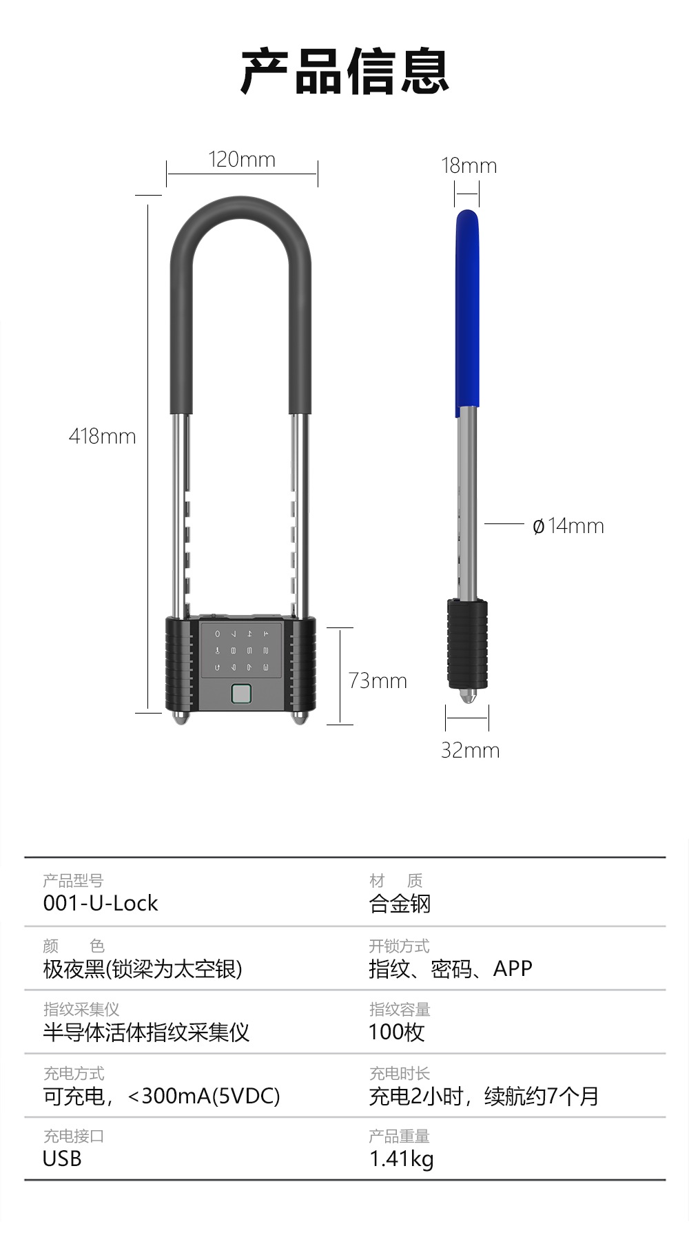 歐米智能U型鎖防盜液壓抗剪,無需鑰匙開鎖,手機APP,密碼指紋輕松解鎖,設(shè)備可共享給身邊的親朋好友,并且權(quán)限可以隨時收回,一把鎖可供好幾人一起使用,手機APP上會有U型鎖電量顯示,電量不足時會發(fā)出提示,產(chǎn)品在開鎖時會生產(chǎn)開鎖記錄,隨時隨地了解鎖在什么時間打開,產(chǎn)品具有IP66的防護等級,即使是在下雨天氣也能使用,智能U型鎖采用USB接口充電,充一次電可使用180天(按照一天開鎖一次來算)。